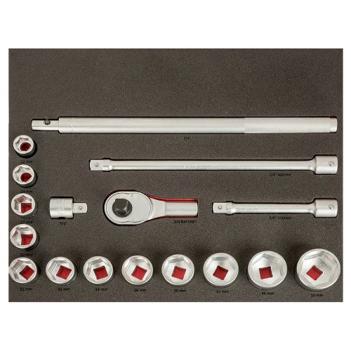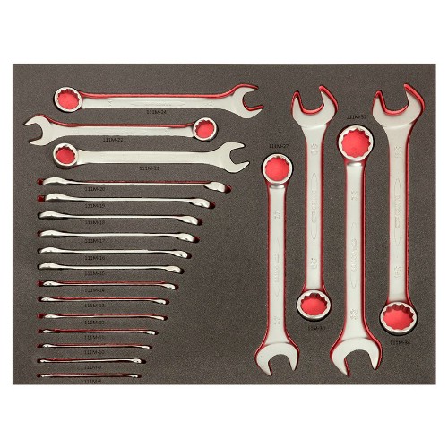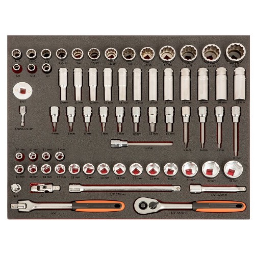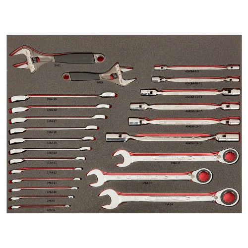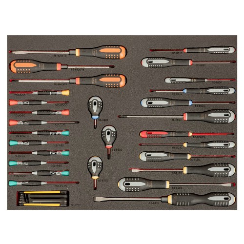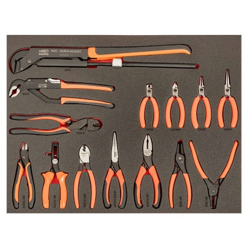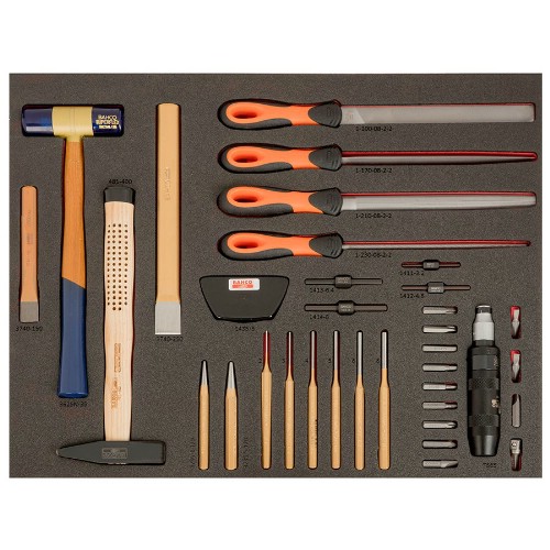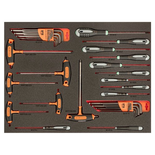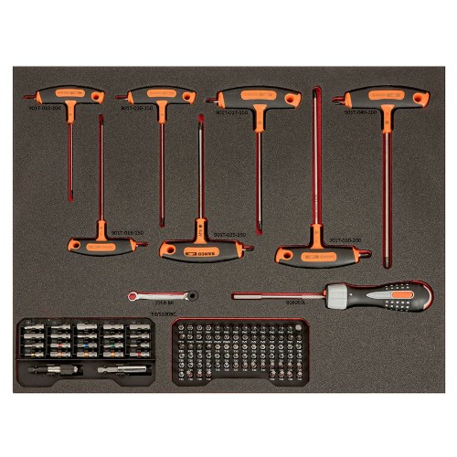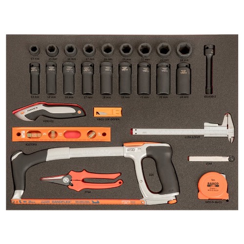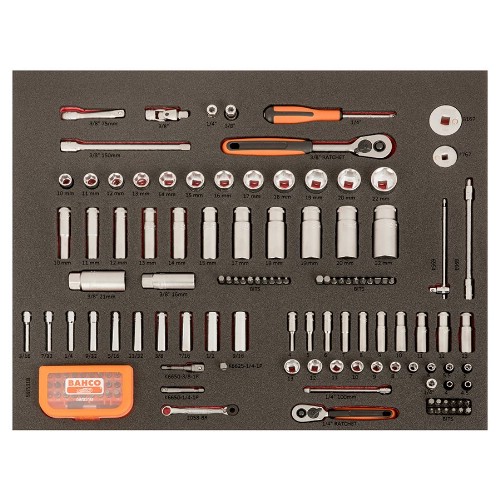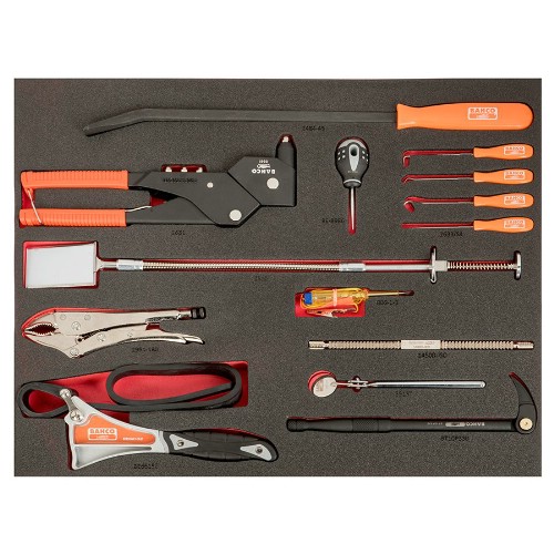 Paket bestående av verktygsvagn och överskåp med sammanlagt 13 lådor, varav 11 med totalt 556 verktyg. Med tålig rostskyddande pulverlack. Utbytbar bänkskiva i komposit. Hörnskydd på varje låda. Tippskyddad genom att endast en låda i taget kan vara öppen. Extra förstärkta dubbla väggar gör att lådorna kan öppnas även om vagnen fått bucklor. Sidofack upptill passar för skruvmejslar och andra handverktyg. Lådorna har glidskenor med kullager och kan öppnas helt. Mjuka gummihjul varav två fasta och två vridbara med broms, tål flertalet vanliga lösningsmedel. Bekvämt handtag av stål med grepp av termoplast. Det runda huvudlåssystemet skyddar mot stöld. Kompakt nyckelhållare innehåller en reservnyckel. Hål på sidan för fäste av tillbehör. Bahcos inlägg med verktyg och BETMS-lösningar passar i lådorna. Förberedd för Bahco Xpand tillbehör.