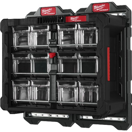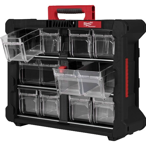 Verktygslåda med 10 st tippfack, 8 st små och 2 st stora transparenta fack. Lådorna kan tippas och tas ut helt. Passar till förvaring av mindre föremål som skruvar, bits, spik etc. Ergonomiskt handtag för bekvämt grepp och transport. Tillverkad i slagtåligt material. Verktygslådan kan monteras på monteringsplatta för väggmontage. Ingår i Milwaukees modulära förvaringssystem Packout.