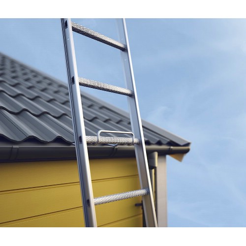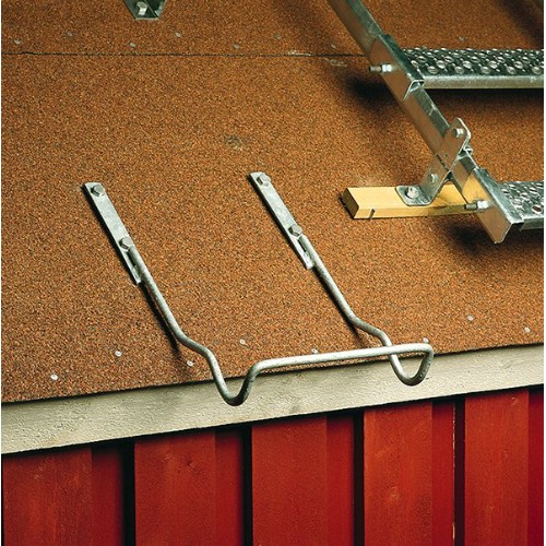 Ett fast glidskydd som hindrar stegen från att både välta i sidled och glida ner längs med väggen. Ska användas då lös stege används för tillträde till tak. Monteras under takpannan, över hängrännan. Placeras så att den anliggande stegen kommer vid sidan om takstegen. Varmförzinkat.