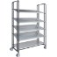 Flexibel backvagn med 5 plan som kan flyttas upp och ner samt vinklas. Hyllplanen kan monteras med kant upp eller ner. Pulverlackerad med elförzinkade hyllor. 2 st fasta och 2 st länkhjul med broms 100 mm, hjulbana av polyuretan. Som tillbehör finns extra hyllplan och praktiskt handtag. Levereras omonterad.