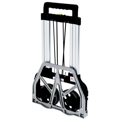 Lätt och smidig bagagekärra i aluminium som tar minimal plats hopfälld. Greppvänligt mjukt handtag. Enkel mekanism gör att hjul och lastplan fälls in samtidigt. Kullagrade massivgummihjul. Spårvidd 440 mm.