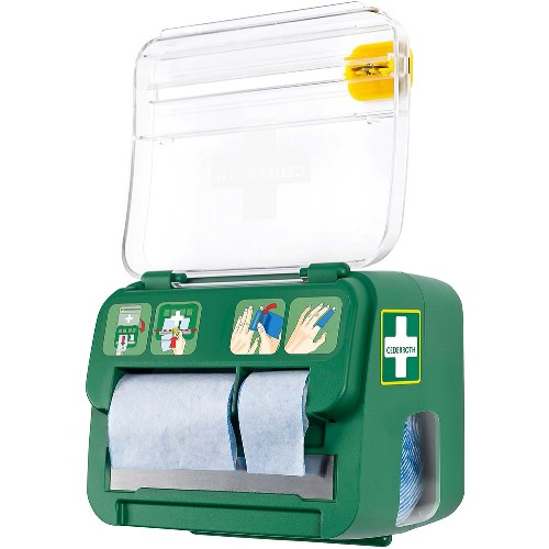 Dispenser innehållande två storlekar av Cederroth Soft Foam Bandage Blå, 3 cm och 6 cm breda. Med integrerad skärkniv för enkel användning med tydliga instruktioner. Kompakt storlek som gör den enkel att montera på väggen, även på små ytor. Dispensern är låst för att förhindra svinn, öppnas enkelt med refillnyckel. En transparent lucka skyddar produkterna mot damm och smuts. Fönster på sidorna gör det enkelt att se när påfyllning behövs.