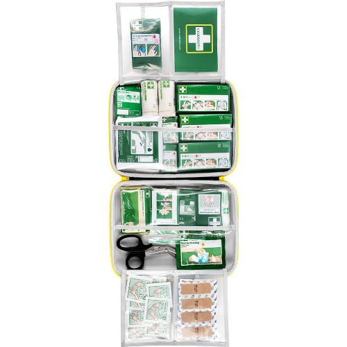 Robust och tålig första hjälpen-väska som är lätt att bära med sig. Produkterna är packade i transparenta plastfickor för tydlig översikt. Väskan skyddar innehållet mot damm och fukt. Signalfärgerna grönt och gult gör väskan väl synlig på långt håll. Passar skador såsom blödning, små och stora sår, andning, brännsår, cirkulationssvikt och stukning. Vikt ca 1 kg.