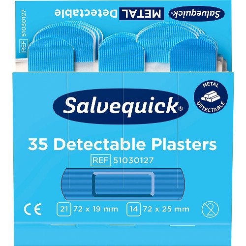Blue Detectable-plåster som är särskilt avsedda för användning inom livsmedelsindustrin. Plåstren är detekterbara och upptäcks av de flesta metalldetektorer. Den blå färgen gör att plåstren också är lätta att upptäcka visuellt. Plåstren är allergitestade, lätta att applicera, flexibla och smidiga att använda. Refill som passar i Salvequick plåsterautomater 490700 och 51030130 samt Salvequick sårvårdsstationer 51011006 och 51011009.