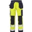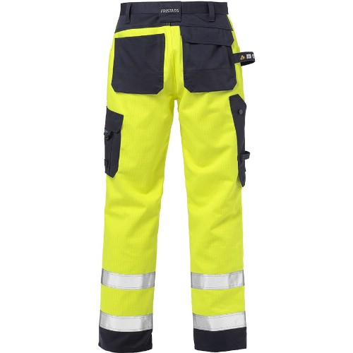 Flamskyddad varselbyxa i slitstarkt flamskyddsbehandlat material. Med mörk färg på partier som ofta utsätts för smuts. Dubbel förstärkt grensöm. 2 Cordura-förstärkta löst hängande spikfickor, den ena med 3 fickor och verktygshällor och den andra med extra ficka. 2 framfickor. 2 Cordura-förstärkta bakfickor, varav en med lock och dold tryckknapp. Cordura-förstärkt tumstocksficka med pennficka samt knapp och hälla för kniv. Benficka med lock och dold tryckknapp, telefonficka med lock, D-ring och ID-kortsficka. Hammarhank. Cordura-förstärkta knäfickor med öppning inifrån och reglerbar höjd av knäskydden. Cordura-förstärkning i benslut. Tvätt 75°C.