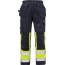 Slitstark flamskyddad byxa med förhöjd synbarhet. Dubbel förstärkt grensöm. 2 Cordura-förstärkta löst hängande spikfickor, den ena med 3 fickor och verktygshällor och den andra med extra ficka. 2 framfickor. 2 Cordura-förstärkta bakfickor, varav en med lock och dold tryckknapp. Cordura-förstärkt tumstocksficka med pennficka samt knapp och hälla för kniv. Benficka med lock och dold tryckknapp, telefonficka med lock, D-ring och ID-kortsficka. Hammarhank. Cordura-förstärkta knäfickor med öppning inifrån och reglerbar höjd av knäskydden. Cordura-förstärkning i benslut. Tvätt 75°C.
