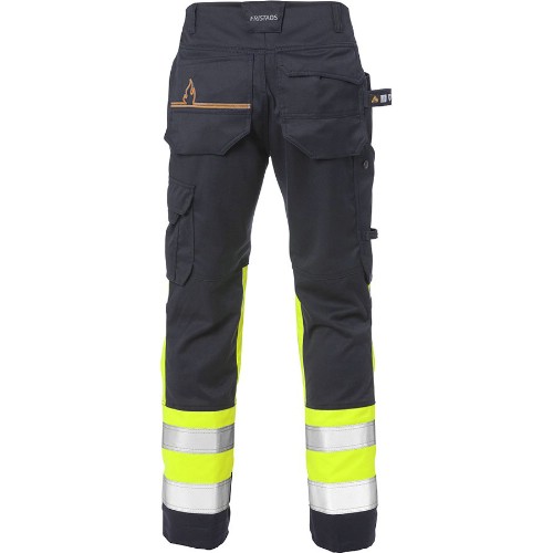 Flamskyddad midjebyxa med feminin passform i ett lätt och smidigt stretchmaterial med bra slitstyrka. Inherent flamskydd och multinorm. Smuts-, olje- och vattenavvisande. 2 framfickor. 2 Cordura-förstärkta löst hängande fickor, den ena med 3 fickor och verktygshällor och den andra med extra ficka. 2 Cordura-förstärkta bakfickor, varav en med lock och dold tryckknapp. Cordura-förstärkt tumstocksficka med pennficka samt knapp och hälla för kniv. Benficka med lock och dold tryckknapp, telefonficka med lock och kardborrelås och D-ring under locket. Hammarhank. Cordura-förstärkta knäfickor med öppning inifrån. Knäskydden i knäfickorna kan höjdjusteras. Dubbel förstärkt grensöm. Cordura-förstärkning i benslut. Reflexer påsydda med 2-nålssöm. Tvätt 60°C.