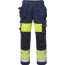 Midjebyxa med varselfärg tillverkad i smuts-, olje- och vattenavvisande material. Två löst hängande Cordura-förstärkta invikbara spikfickor, den vänstra med extra ficka, den högra med tre fickor och verktygshällor. Två framfickor med tryckknapp. Två bakfickor. D-ring vid linningen, hammarhank. Benficka med lock, telefonficka med lock, D-ring och id-kortshållare i plast. Cordura-förstärkt tumstocksficka med verktygsficka samt två knappar och hällor för kniv. Knäfickor i Cordura, öppning inifrån och reglerbar höjd av knäskydden. Cordura-förstärkta benslut och förböjda ben. Tvätt 85°C.