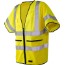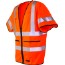 Varselväst med kort ärm och frontstängning med dragkedja. Två stora framfickor med dragkedja och en bröstficka med kardborrestängning. Två hällor på bröstet för t ex mikrofonsladd och upphängningsögla.
