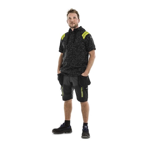Kortärmad huvtröja i sweatshirt-material. Reglerbar huva med dragsko. Kort dragkedja fram. Raglanärm. Reflexdetaljer på axlar. Tvätt 40°C.