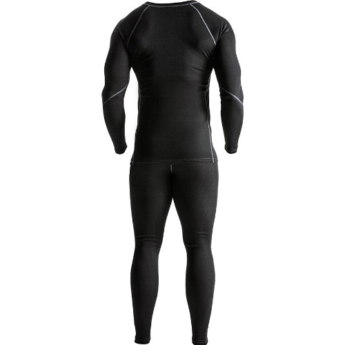Undertøy laget av hurtigtørkende materiale som transporterer fuktighet vekk fra kroppen. Sett med genser og langunderbukse. Flatlock strikkede sømmer i kontrastfarge. Vaskes på 60°C.