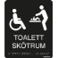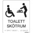 Skylt i hårdplast med 98% återvunnet material, med upphöjd punktskrift (taktil). Hög färgkontrast mellan bakgrund och text/punktskrift/symbol. Skylten är anpassad för utrymmen och lokaler där både seende och synskadade/synnedsatta vistas. Symbol för handikappanpassning och skötbord, text "toalett" och "skötrum" på två rader samt punktskrift.
