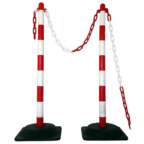 Set med 2 st avspärrningsstolpar. Tillverkada av plast. Med 4 öglor för upphängning upptill. Avsedd för 8 mm plastkätting (ingår ej).