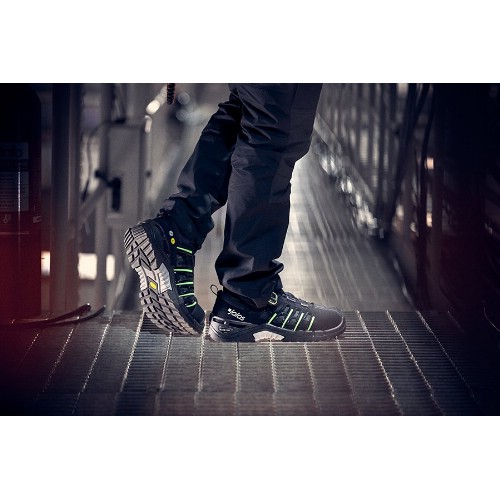 Låg skyddssko med strumpliknande konstruktion och BOA-stängning på sidan. Tåhätta i aluminium. Överdel i mikrofiber skyddar mot slitage. Ventilationshål med nät håller fötterna svala och förhindrar grus att komma in i skon. Foder i polyamid som andas och absorberar fukt. Ergothan stötdämpningssystem med innersula i 4 lager och Poron XRD för komfort och stötdämpning. Värme- och oljebeständig yttersula i nitrilgummi med bra halkskydd. Spiktrampskydd av plasmabehandlad textil. Stabilizator. Antistatiska egenskaper.