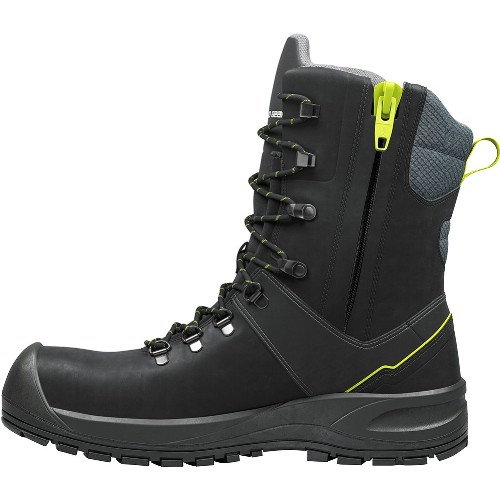 Hög skyddskänga för vinterbruk med tåhätta i glasfiber och mjukt spiktrampskydd. Ovandel i en kombination av LWG-läder och textil med ventilerad linning och extra foder av återvunnen polyester och syntetisk päls. Innersula av Open cell PU-foam och PU mellansula ger stabilitet och komfort. Vinteranpassad halk-, värme och oljebeständig slitsula i gummi. YKK-dragkedja. Bred läst.
