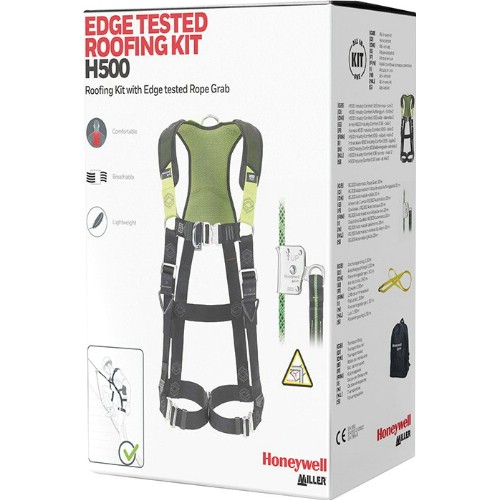 Komplett fallskyddspaket för arbete på tak. Består av fallskyddssele H500 IC6 H-design med stor rörelsefrihet. Lätt och smidig att ta av och på. Tryckavlastande vadderingar på axlar och rygg som minimerar trötthet och överansträngning i muskler. Hög andningsförmåga. Optimal komfort runt ben och axlar. Sidojusteringsremmar som ger extra bra passform. H-design för ben ger ökad användarkomfort. D-ring framtill och SRL-länk på ryggen för enkel anslutning av t.ex fallskyddsblock. Användarvänliga hållare gör det möjligt för användare att haka fast t.ex ställningskroken när man inte använder den. Tydligt identifierbara fallindikatorer för problemfri inspektion. Lättvikts Cobra-snabbspännen i aluminium. Inbäddad RFID-tagg för problemfri inspektion. Vattenavvisande band. Låg vikt. Godkänd för max 140 kg. 20 m kanttestad fånglina (Ø 11 mm) RG300, med glidlås som låser automatiskt på repet vid fall. Glidlåset i hållbar korrosionsbeständig konstruktion i rostfritt stål och med koppling som underlättar förankring på sele. Förankringssling 1,5 m och förvaringsväska.