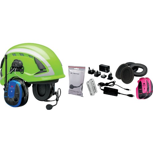 Hjälmkåpa för skyddshjälm som kan anslutas till upp till två enheter, till exempel en mobiltelefon och en kommunikationsradio, via Bluetooth MultiPoint Technology. Kopplas till iOS- och Android-enheter via 3M Connected Equipment-appen som är tillgänglig på App Store och Google Play, och som gör det enklare att ställa in och justera headsetet. Röstguidat menysystem med frekvensannonsering, digital stationssökning och möjlighet att spara sina favoritstationer. Även utrustad med bullerreducerande bommikrofon, nivåberoende funktion för omgivningsljud, push-to-listen-funktion och inbyggd FM-radio. Batteritid ca 58 h (FM-radio med medhörning) och ca 78 h (strömmning via Bluetooth med medhörning). Stängs av automatiskt efter fyra timmars inaktivitet och har en varningsindikator för låg batterinivå. Utbytbara hygiensatser. Skyddshjälm ingår ej. Dämpningsvärde SNR 30 dB. Levereras med 2 st uppladdningsbara Ni-MH AA-batterier, USB-laddare FR09, USB-adapter FR08, 2 st rosa extraskal till hörselkåporna, 1 st hygiensats HY82 och användarmanual. Skyddshjälm ingår ej.