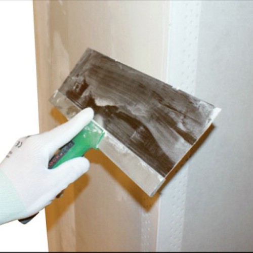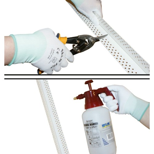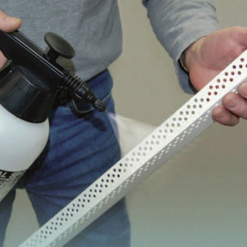 Vattenaktiverande, självhäftande hörnskydd för gipsskivor. Ger snabbt och enkelt hållbara och slagtåliga hörn på standardgipsskivor. Anpassad för optimal vidhäftning mot gipsskivans kartongyta. Kapas enkelt med plåtsax till önskad längd. Spraya rent vatten på insidan av hörnskyddet. Se till att få vatten på listens båda förlimmade insidor. Vänta i ca 30 sekunder tills limmet aktiverats. När limmet känns klibbigt är den färdig att monteras. Placera den självhäftande insidan av hörnskyddet på vägghörnet och upp mot taket. Placera hörnskyddet vinkelrätt över hörnet så att hörnskyddet går i liv med vägghörnet. Tryck fast hörnskyddet noga över hela ytan för hand eller med hjälp av ett rullverktyg. Efter ca en halvtimme kan första lagret spackel appliceras.