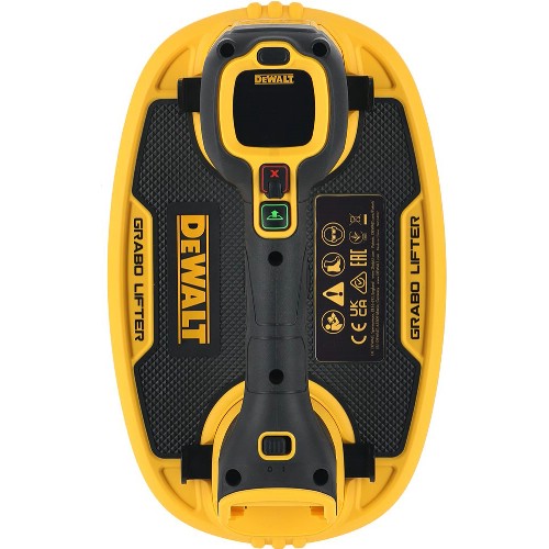Sladdlös vakuumlyft 18 V Li-Ion för att lyfta, bära och hantera olika byggmaterial. Mångsidig användning, fungerar på släta, halvporösa och strukturerade ytor. Lyfter porösa material som sten, gips, trä, betong, plywood, cementskivor etc. Lyfter icke-porösa material som glas, färdigbearbetad glasfiber, slät kakel, plast, marmor etc. Under idealiska förhållanden lyfter den upp till 120 kg horisontellt, och upp till 60 kg vertikalt. Stor och tydlig digital display som visar trycket i bar eller PSI, sugnivåer och batteriladdningsnivåer. Återställer och upprätthåller vakuumtrycket automatiskt. Ljudvarning och visuella varningar om sugtrycket eller batterinivåerna når miniminivåer. Separat pumpknapp och tvåstegs frigöringsknapp för säker användning. Helprofilerat handtag med glidsäkert grepp. Utbytbar tätning minimerar stilleståndstiden och möjliggör enkelt underhåll. Automatisk avstängning. Avtagbart solskydd för LED-displayen. Försedd med öglor för att fästa remmar som kan förenkla hanteringen av tyngre material. Kompatibel med alla Dewalt 18 V XR-, Powerstack- och Flexvolt-batterier.