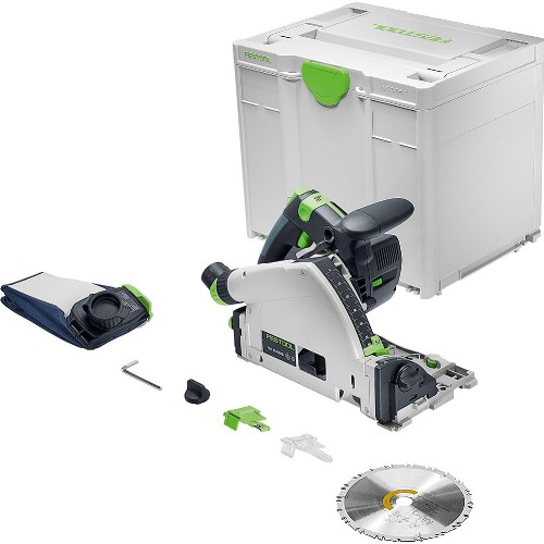 Standardutstyr: HM sirkelsagblad Ø 160 mm Z35, støvpose, splintbeskyttelse, siktvindu, unbrakonøkkel og oppbevaringskoffert Systainer SYS3 M 337.