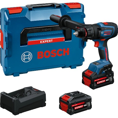 Standardutstyr: 2 x 18 V 8,0 Ah Expert-batterier, hurtiglader, belteklips, støttehåndtak og oppbevaringskoffert L-BOXX.