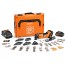Standardutrustning: 2 st 4,0 Ah Li-Ion batterier, 1 st snabbladdare GAL 1880 CV, 2 st E-Cut standardsågblad curved (35 mm), 2 st E-Cut standardsågblad curved (65 mm), 1 st E-Cut Precision-sågblad (35 mm), 1 st E-Cut Precision-sågblad (65 mm), 1 st E-Cut Long-Life sågblad (10 mm), 2 st E-Cut Long-Life sågblad (35 mm), 1 st E-Cut Long-Life sågblad (32 mm), 1 st E-Cut Long-Life sågblad (42 mm), 1 st E-Cut Carbide Pro sågblad (32 mm), 1 st sågklinga segmenterad (Ø 85 mm), 1 st segmentsågklinga av hårdmetall, 1 st HM Rasp (trekantform), 1 st spackel, 1 st kniv med svampform, 1 st multikniv, 1 st slipplatta hålad, vardera 10 st slippapper hålade (K 60, 80, 120, 180), 1 st utsugningsanordning och staplingsbar förvaringsväska L-BOXX 136.