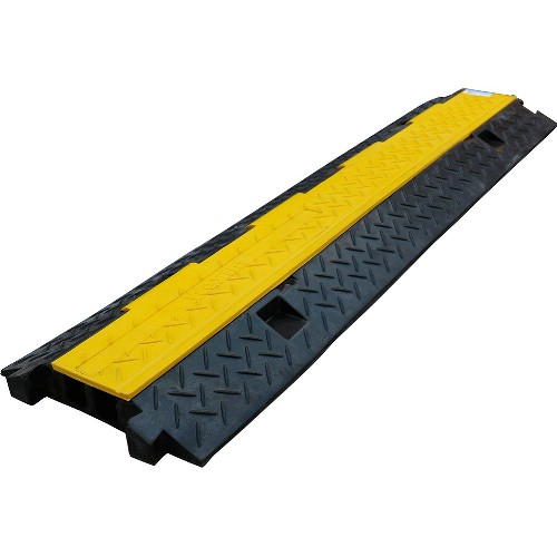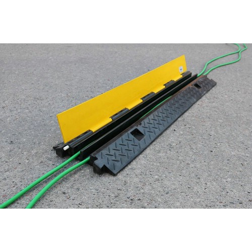 Två-kanalig kabelbrygga som används för att skydda kablar, slangar eller rör mot fordon och fotgängare. Användbar på byggarbetsplatser där tillfälliga installationer utförs och det som ska skyddas korsar en väg. Tillverkad i slitstarkt gummi och klarar ett tryck på 20 ton. Den gula delen viks upp för att lägga i det som ska skyddas och stängs sedan. Flera kabelbryggor sammankopplas enkelt till önskad längd. Kanalstorlek 30x25 mm.