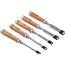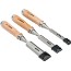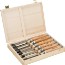 Sats med stämjärn. Av helsmitt högkvalitativt stål i bladet och med konisk hals. Bladen är snedslipade på båda sidor ned till halva bladtjockleken. Polerat och färdigskärpt för användning. Handtag av rödbok med nickelskodda ändar för att motverka sprickbildning vid användning av träklubba. Skydd för spetsen ingår.