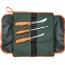 Leveres med et vannavvisende knivfuteral som holder orden på utstyret, har plass til fem kniver og et slipestål, er laget av resirkulert polyester og har to låseknapper.
