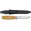Slidkniv med fingerskydd/parerstång. Blad av kolstål och skaft av oljad björk. Knivslida av plast.