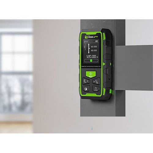 En unik avstandsmåler som måler i begge retninger eller opp og ned. Nå er det slutt på å stå på kne for å måle takhøyden, eller gå bort til veggen for å finne bredden. Med Elma Laser 4 Dual måler du ganske enkelt midt i rommet, og med den doble laseren måles både avstanden til taket og gulvet, og den totale romhøyden vises. Eller stikk hånden gjennom loftsluken og mål hele lengden på loftsgulvet med ett trykk. Det sparer tid og sikrer nøyaktig måling. Laseren er også utstyrt med et digitalt fargedisplay som roterer avhengig av hvordan instrumentet holdes, noe som gjør avlesningen enkel. I tillegg til den digitale visningen av helningen er det lagt til en digital versjon av vaterboblen, som indikerer med en klar grønn farge når instrumentet holdes vannrett. Videre er instrumentet utstyrt med mange standardfunksjoner fra profesjonelle avstandsmålere, som Tracking for kontinuerlig måling, Pythagoras-funksjon for indirekte måling av f.eks. fasadehøyder osv. Det har også +/- funksjon og kalkulator for beregning av arealer og volum.