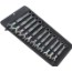 Av krommolybdenstål och beläggning av nickel och krom ger lång livslängd, hög slitstyrka och varaktigt korrosionsskydd. Liten returvinkel, endast 30°, mekanism med dubbel sexkant. 80 tänders spärrmekanism på ringsidan ger flexibilitet i trånga utrymmen. Ändanslag som förhindrar att nyckeln glider ner från skruvhuvudet. Hållarfunktion som sätter muttrar och skruv enkelt på plats. Den härdade metallplattan i nyckelns gap förhindrar avglidning också vid höga vridmoment. Levereras i skyddande verktygsfodral.