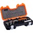 Hylsnyckelsats med genomgående hylsor. Verktyg av mattförkromat kromvanadinstål. Väska av HDPE plast.