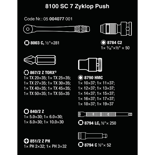 Komplett hylsnyckelsats i 28 delar med spärrnyckel, 6-kant hylsor, förlängare och bits. Finns i två utföranden – Med spärrnyckel Zyklop Metal 8003, med genomtrycks-funktion för ändring av riktning eller med spärrnyckel Zyklop Metal 8004, med omkopplingsspak för ändring av riktning. Båda modellerna med säker låsning av hylsan och låg returvinkel.