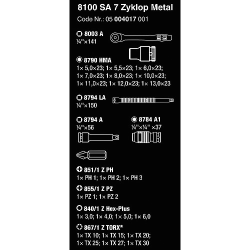 Komplett hylsnyckelsats i 28 delar med spärrnyckel, 6-kant hylsor, förlängare och bits. Finns i två utföranden – Med spärrnyckel Zyklop Metal 8003, med genomtrycks-funktion för ändring av riktning eller med spärrnyckel Zyklop Metal 8004, med omkopplingsspak för ändring av riktning. Båda modellerna med säker låsning av hylsan och låg returvinkel.