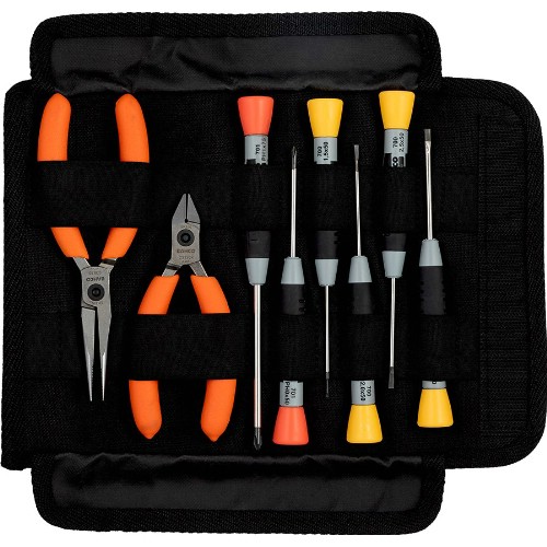 Verktygssats i 8 delar med 6 st precisionsskruvmejslar, 1 st sidavbitare med avfasat och urfräst huvud och 1 st spetstång med långt huvud. Levereras i mjuk förvaringsväska.