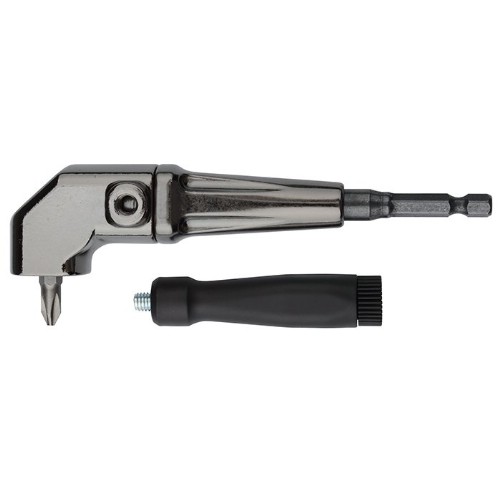 Vinkelbitschuck med 1/4" sexkant snabbchucksfäste i 90° vinkel. Roterbar 360°. Plasthandtag kan skiftas höger/vänster. Levereras med 1 st PH2 bits. För 1/4" bits.