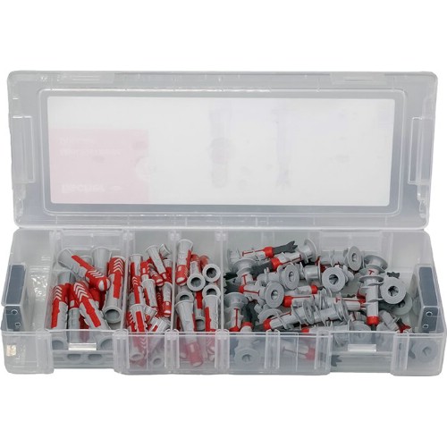 Sortimentbox med 47 st Duopower-plugg och 30 st Duoblade gipsplugg.