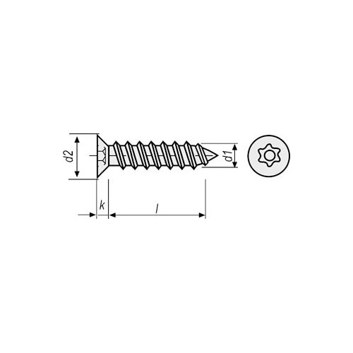Rostfri säkerhetsskruv för plåt, försänkt Torx-skalle med tapp. Tappen gör att ett verktyg med hål måste användas. Gängpressande.