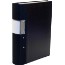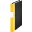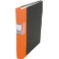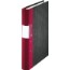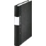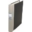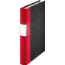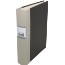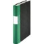 Gaffelpärm med tygklädd trärygg och kantförstärkning. Svarta pärmsidor. Etiketthållare.