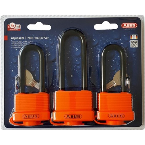Hänglåsset med 3 st hänglås i lika låsning. För låsning av t.ex. grindar, dragkrok, släpvagn, dörrar, portar, skåp, verktygslådor, källarfönster, förråd etc. Två bygelhöjder för anpassning till släpvagnar där avståndet mellan låspunkterna kan variera. Tillverkade av massiv mässing med precisionsstiftcylinder och dubbel bygellåsning som ger bra skydd mot dyrkning. Signalerande färg på låshus. Låshus och bygel är helkapslade för extra skydd mot smuts, fukt och repor. Förhöjt skydd mot dyrkning genom nyckelns speciella profil. Självlåsande, låset stängs utan nyckel genom att trycka ner bygeln. Cylindrar med lika låsning, kan öppnas med samma nyckel. Ingen certifierad klassning på dessa lås, men uppfyller kraven enligt klass 1.