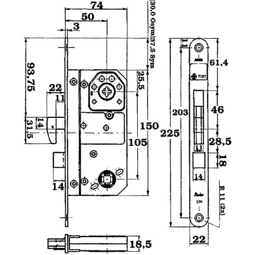 Egenskaper: Uppfyller fordringar enligt Svensk Standard SS 3522, klass 3. Ingår i av försäkringsbolag godkänd låsenhet. Med tryckesfall och hakregel. Automatisk förregling av regel vid 360° nyckelvridning. Härdad och tvångsstyrd hakregel. Ger kopplande förband mellan dörr och karm. Vändbar tryckesfall för alternativ dörrhängning. Tryckesfall av stål för brandklassade dörrar. Kan erhållas med inbyggd mikrobrytare.