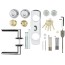 Innhold: Sikkerhetssylinder, dørhåndtak New York med dobbeltvirkende returfjær og beslag. Monteringsskruer, bor og et utvalg av verktøy.