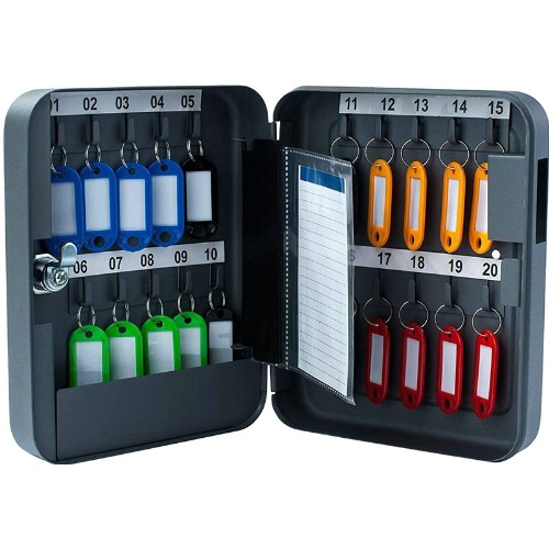 Låsbart nyckelskåp i metall. Levereras med nyckelbrickor, självhäftande nummer, etikettbord och väggfästen. Med möjlighet att returnera nycklar utan att nyckelskåpet behöver låsas upp.