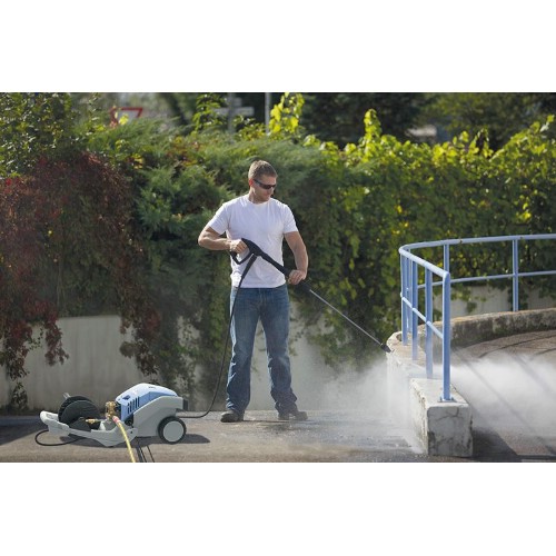 Kompakt högtryckstvätt för kallvatten. Max arbetstryck på 130 bar. Professionell 1-fasmaskin för hem och trädgård. Ventilhus i mässing och keramiskt belagda kolvar. Snabbkopplingssystem D10. Utrustad med start- och stoppautomatik. Praktisk förvaring av spolrör och pistol. 12 m högtrycksslang på slangvinda med infällbar vev. Robust chassi för enkel transport och hög stabilitet. Max vattentemperatur 60°C.