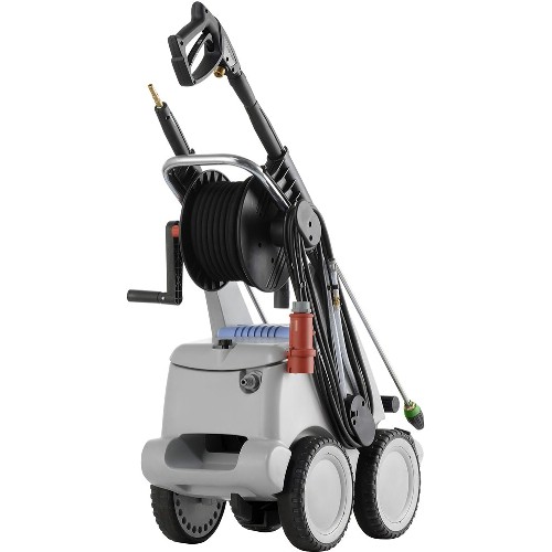 Kraftfull 3-fas högtryckstvätt för effektiv rengöring av hårt smutsade ytor. Arbetstryck på 150 bar. 20 m högtrycksslang på slangvinda med vikbar vev. Axialpump med kraftöverföring via stabil vevaxel med vevstakar och kolvar som ger extremt lång livslängd. Inbyggd avlastningsventil. Inbyggd vattentank på 10 liter, förhindrar skador på högtryckspumpen när det inte finns tillräckligt med vatten. Totalstoppsystem med fördröjd motorstopp. Säkerhetsavstängning. Tryckreglering Insugning av rengöringsmedel, keminjektor. Manometer av rostfritt stål för enkel avläsning av arbetstrycket. Robust chassi gjutet i ett stycke. Försedd med stötdämpare som skyddar mot skador på högtryckspumpen. 4 st stora hjul gör den enkel att transportera. Parkeringsbroms. Praktiska hållare för högtryckspistol och rengöringslans. Snabbkopplingssystem D12. Max vattentemperatur 60°C.