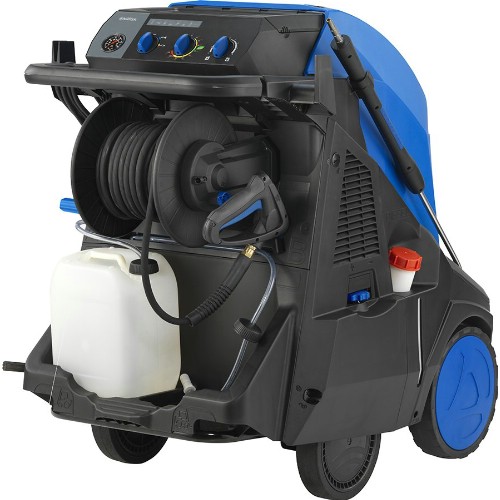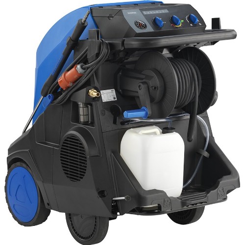 3-fas hetvattentvätt i mellanklassen som passar för de lite mer krävande rengöringsuppgifterna i 4-6 timmar per dag. Utmärkt prestanda för allmän hetvattenrengöring och är utrustad med effektiv EcoPower panna EcoMode-funktion. Högeffektiv 4-polig motor. Mässingtoppstycke. NA5-pump med tre kraftiga keramiska kolvar. Stort inloppsvattenfilter som skyddar pumpen mot orenheter. Flödesstyrt avlastningssystem. Säkerhetsfunktion som varnar om låg bränslenivå. Inbyggt diagnostiseringssystem. Service och underhåll utförs snabbt och lätt, då alla viktiga delar är enkla att komma åt och inspektera. 4 stora hjul och en väl balanserad tyngdpunkt gör den enkel att transportera, kan lätt skjutas/dras över ojämna ytor. Tillbehörsförvaring med dubbel spolrörshållare, svängbar kabelhake för enkel hantering av strömkabel. Innovativ hållare till spolhandtaget. Levereras med 10 l kemtank som standard och med plats för en extra tank.