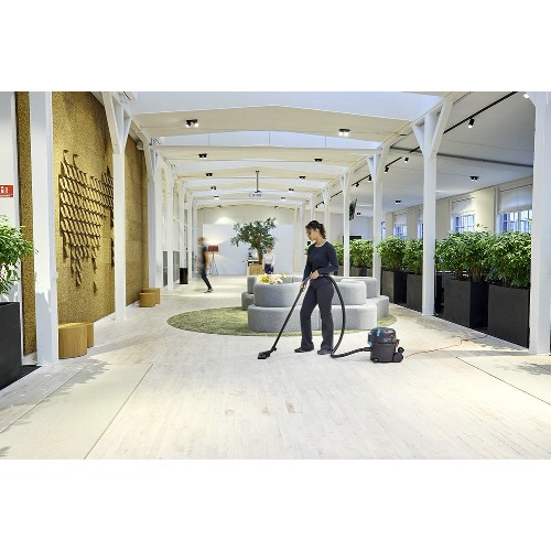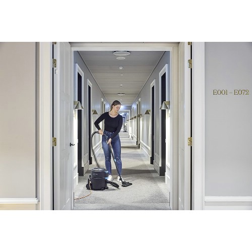 Kompakt och smidig dammsugare för vardaglig rengöring. Optimal för rengöring av kontor, hotellrum, butiksytor och liknande användningsområden. Utrustad med H14 HEPA-filter som effektivt avlägsnar damm, pollen, mögel, bakterier och luftburna partiklar. Dammsugarpåse med kapacitet på 10 liter. Låg ljudnivå och låg vikt. Färgade beröringspunkter guidar användaren till var man ska interagera med maskinen. 15 m kabel på vinda säkerställer smidig och användarvänlig drift. Fotreglerad strömbrytare. Diskret och säker förvaring av tillbehör mellan bakhjulen. Enkelt byte av förfilter och HEPA-filter för att bibehålla sugstyrka och rengöringsprestanda.