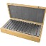 Parallellbitsats med 14 par härdade och slipade parallellbitar med olika höjder. Hårdhet 55-60 HRC. Används för parallellt stöd av föremål i maskindelar eller enheter. Levereras i förvaringslåda av trä. Nominellt mått enligt ISO 2768 M.