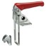 Med vertikalt arbetande bygel för förslutnings och drag moment. Med horisontell fästplatta. Plastklätt handtag. Förzinkad. Komplett med mothåll.